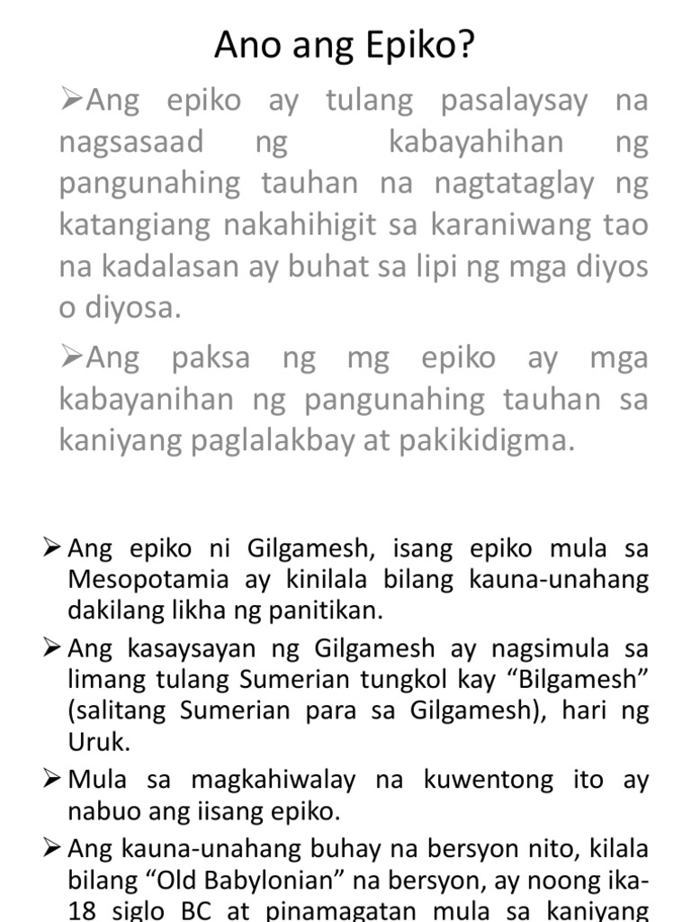 Salamat sa inyong maiiging pagbabasa. Filipino Unang Markahan Modyul 4 Akdang Pampanitikan ng Mediterranean Epiko Kagawaran ng Edukasyon Republika ng Pilipinas 1 0. Nagsimula ang epiko sa pagpapakilala kay Gilgamesh ang hari ng lungsod ng Uruk na ang dalawang katlo ng pagkatao ay diyos at ang sangkatlo ay tao.