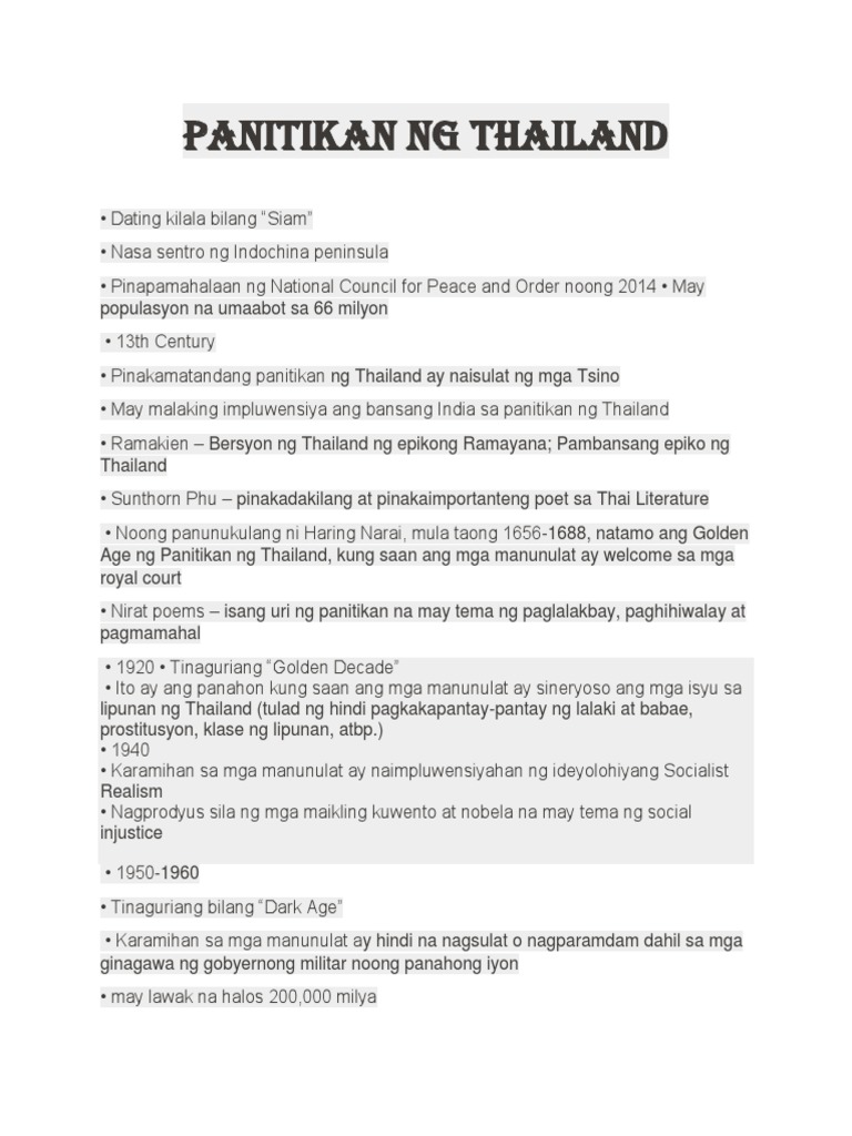 It is situated between Indian Ocean and South China Sea and bordered by Myanmar. Ito ay isang powerpoint presentation na tumatalakay sa Uri ng Panitikan na umusbong sa bansang Thailand. Epiko ng bansang thailand Last Update.