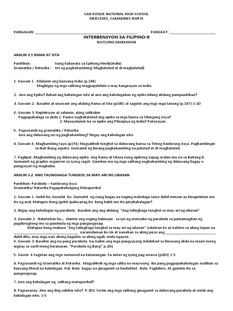 Filipino 9 Remedial Ikatlong Markahan Pdf