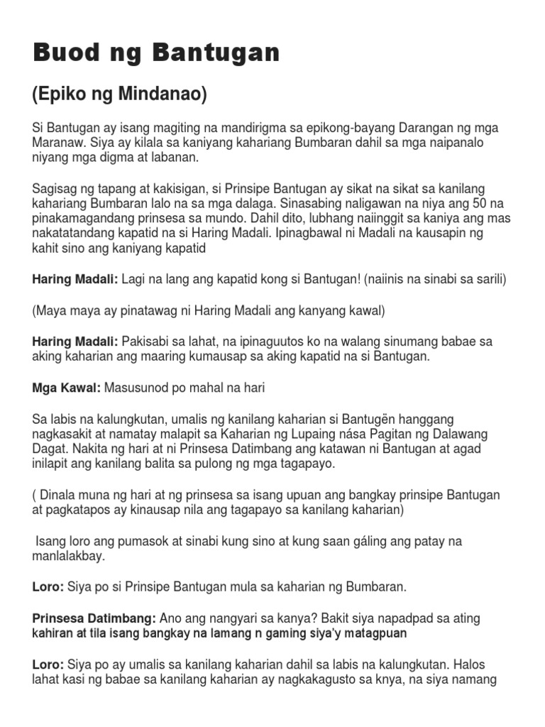 ARAL SA EPIKONG BANTUGAN Sa paksang ito ating tatalakayin kung ano nga ba ang mga aral na makukuha natin sa kuwentong Bantugan. Malungkot ang sinapit ni Haring Bantugan sa kabila ng kanyang mga nagawang kabutihan hindi iba sa. Ang mga halimbawa ng epiko ng Mindanao na may buod na pinamagatang Darangan ay bersyon naman ng kwentong Bantugan ng mga Maranao.