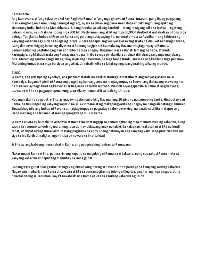 Ramayana-isang epiko tungkol kina prinsipe Rama ng Atodhya at sa kanyang asawa na si SitaAng nasabing akda ay nagpapakita ng kultura ng mga sinaunang Hindu at paano sila namuhay. Buod Ng Rama At Sita Buod Ng Isang Epikong Hindu. Minsan isang babae ang dumalaw sa kanila.