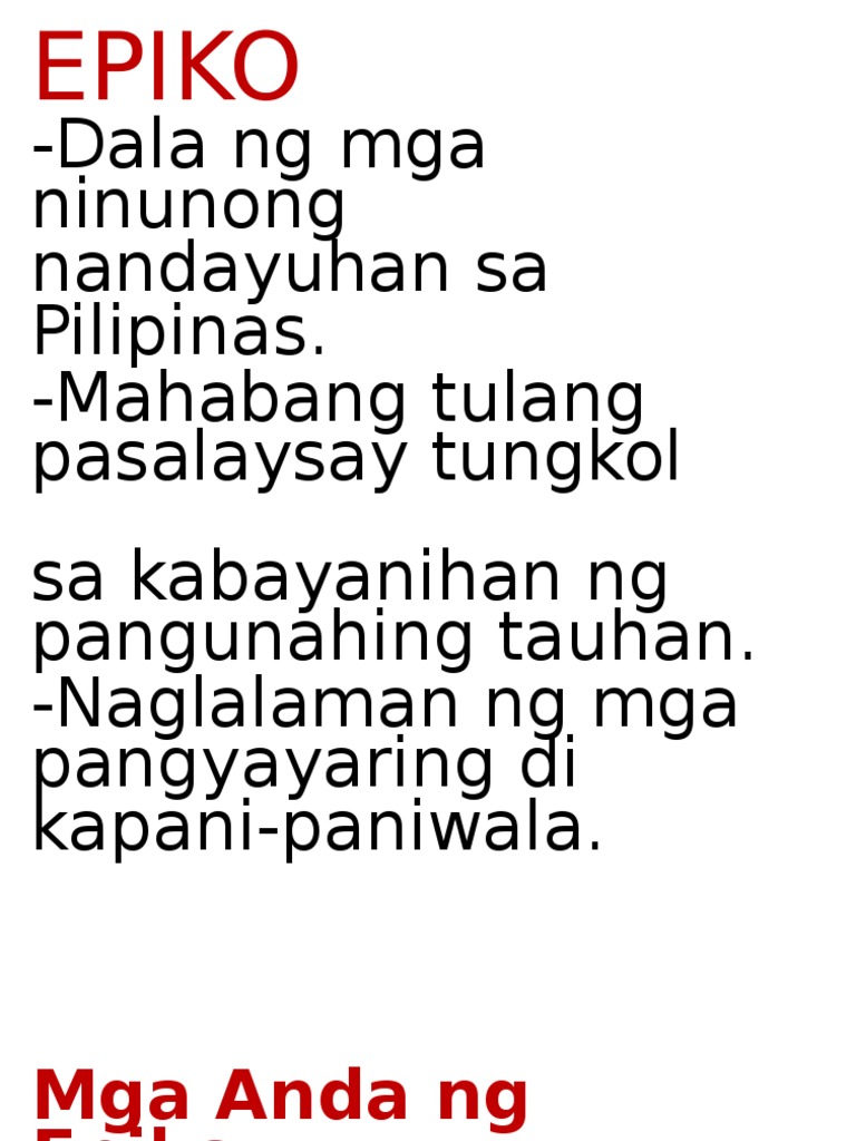 View Mga Anda ng Epikopptx from AS MISC at Central Luzon State University. Ito ay pangunahing pasalitang anyo ng pampanitikan na matatagpuan sa mga ibat-ibang grupong etniko. ANO ANG UNANG EPIKO.